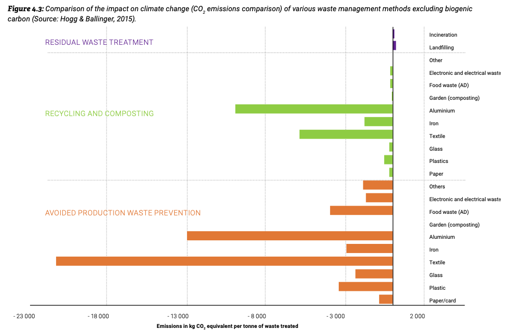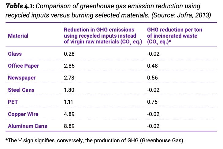 La quantité émis en CO2 en brulant des déchets carbonés (origine fossile) pour produire de l’énergie est souvent comparé dans les documents des constructeurs des incinérateurs aux émissions qui viendraient des décharges (même quantité). Et ceci en générant de l’énergie et de la chaleur comme si on brulait du charbon. Mais en comparaison avec une politique de séparation des déchets, recyclage et compostage les incinérateurs sont bien plus polluant pour le climat.